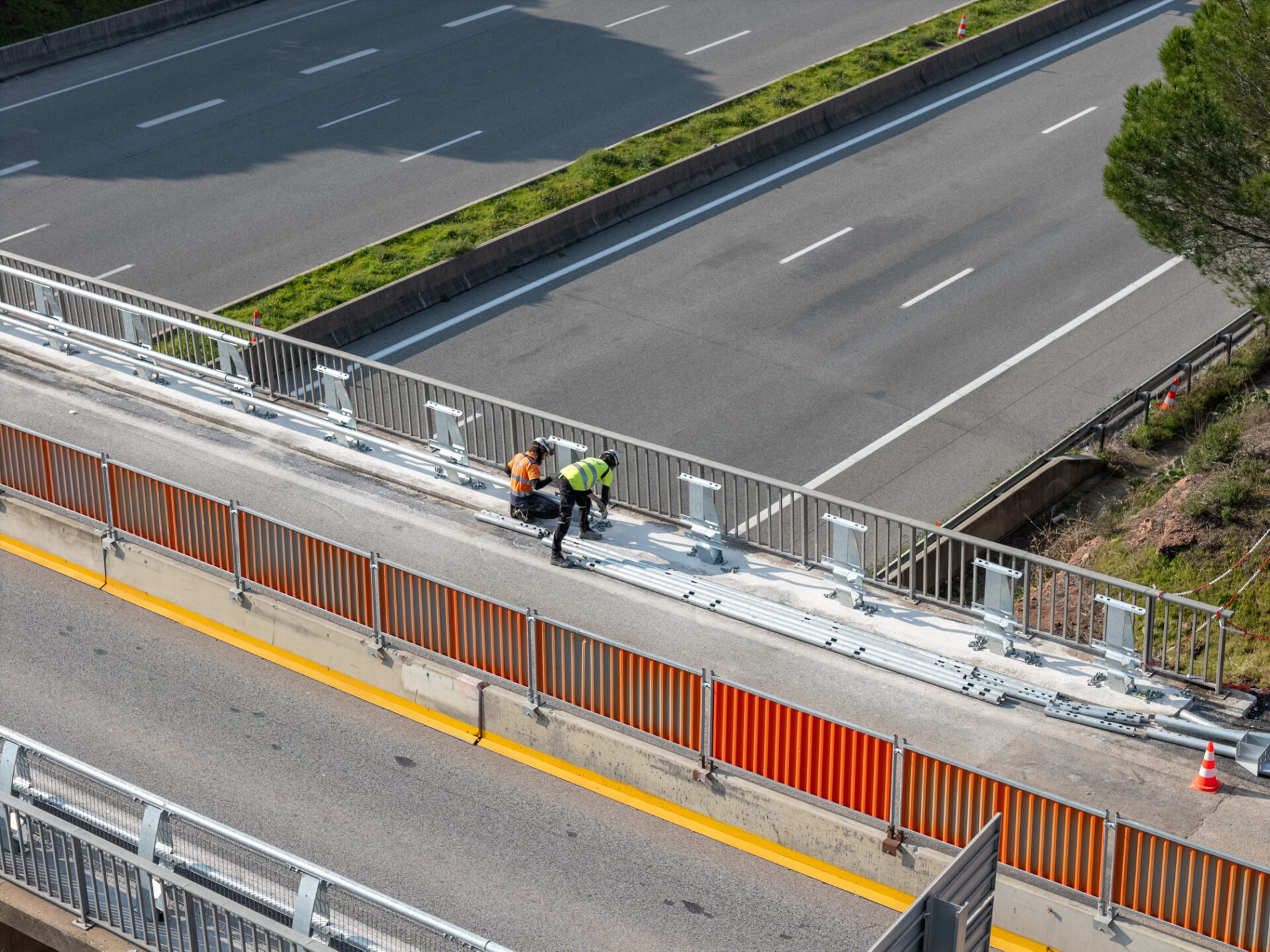 Dans le cadre de la maintenance des infrastructures et des ouvrages d’art du réseau VINCI Autoroutes, les équipes ont procédé à des travaux de rénovation des barrières de sécurité au niveau de l’échangeur du Muy (n°36) sur l’autoroute A8. Ces travaux ont consisté à rénover les dispositifs de sécurité situés sur le pont qui passe au-dessus de l’autoroute A8. Les équipes ont travaillé au niveau des ouvrages qui supportent les bretelles d’entrée et de sortie de l’échangeur.